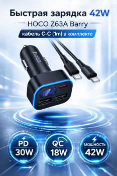 Автомобильное зарядное устройство HOCO Z63A Barry 42W (1C2A) — компактное и мощное устройство для быстрой зарядки гаджетов в пути. Поддерживает современные протоколы быстрой зарядки PD, QC, FCP и AFC, что позволяет эффективно заряжать смартфоны, планшеты и другие устройства.