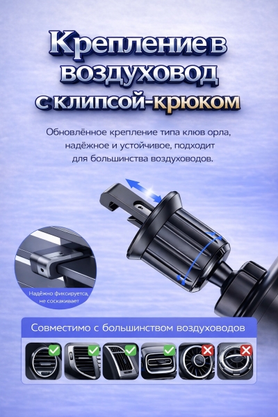 Держатель устанавливается в дефлектор вентиляции и надежно удерживается даже во время движения. Корпус выполнен из прочного ABS-пластика с силиконовыми вставками, которые защищают смартфон от царапин и предотвращают скольжение. Компактная конструкция не перекрывает обзор и подходит для повседневных поездок.