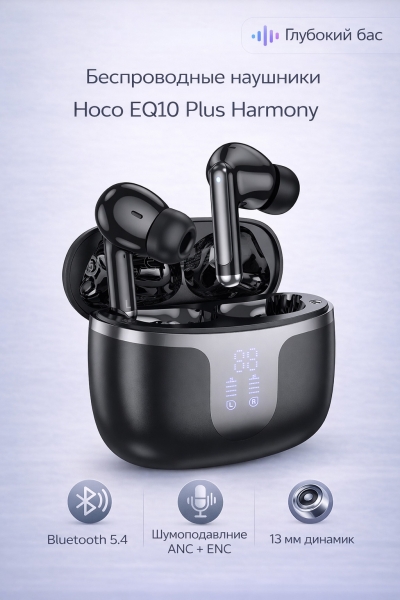 Hoco EQ10 Plus — это идеальный выбор для тех, кто ищет стильные и функциональные беспроводные наушники с высоким качеством звука и современными технологиями шумоподавления.