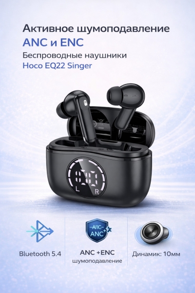 Беспроводные наушники Hoco EQ22 Singer — идеальный выбор для тех, кто ценит качество звука, комфорт и современные технологии. Эта модель сочетает стильный дизайн, продуманную эргономику и передовые функции для музыки, звонков, спорта и повседневного использования.