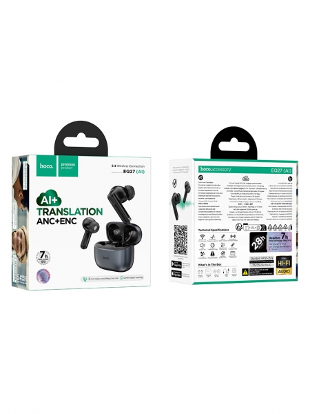 Hoco EQ27 — инновационные беспроводные наушники с поддержкой ANC+ENC шумоподавления и функцией AI-переводчика. Устройство обеспечивает качественный звук с мощным басом, кристально чистую передачу голоса и поддерживает онлайн-перевод в 134 языках через приложение (Android/iOS).