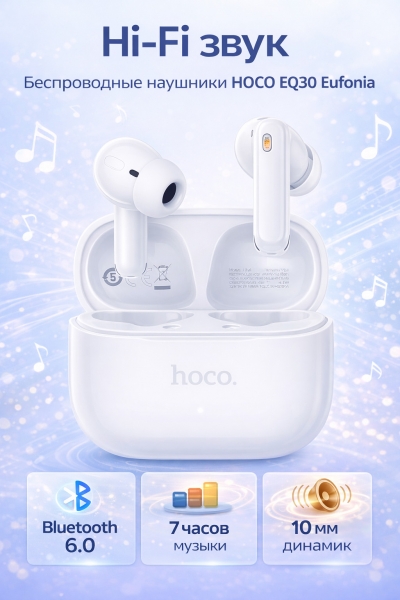 Беспроводные наушники HOCO EQ30 Eufonia — внутриканальные TWS-наушники с насыщенным чистым звучанием и автономностью до 7 часов. Модель оснащена 10 мм динамиком, который обеспечивает глубокие басы и детализированные высокие частоты. Силиконовые амбушюры создают плотную посадку и дополнительную шумоизоляцию для комфортного прослушивания музыки и разговоров. Bluetooth 6.0 гарантирует стабильное соединение, а сенсорное управление позволяет удобно управлять треками и звонками. Полная зарядка занимает всего 1,5 часа.