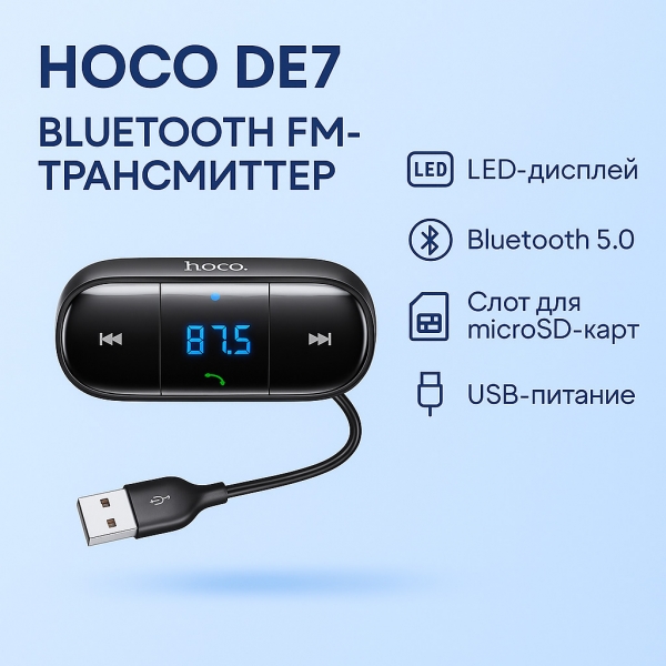 FM-трансмиттер Hoco DE7 Fame Digital Display — это компактное и удобное устройство, которое позволяет передавать звук со смартфона или планшета на аудиосистему автомобиля. Вы сможете слушать музыку, подкасты и пользоваться громкой связью без лишних проводов и сложных настроек.