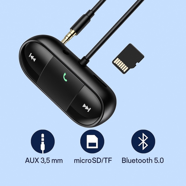 Устройство поддерживает несколько способов воспроизведения звука: Bluetooth 5.0, слот для microSD/TF-карт и AUX 3.5 мм. Это дает возможность выбирать наиболее удобный вариант подключения. Через Bluetooth трансмиттер обеспечивает стабильное соединение без помех, а поддержка карт памяти позволяет слушать музыку в форматах MP3, WMA, WAV и FLAC напрямую. AUX-кабель также входит в комплект.