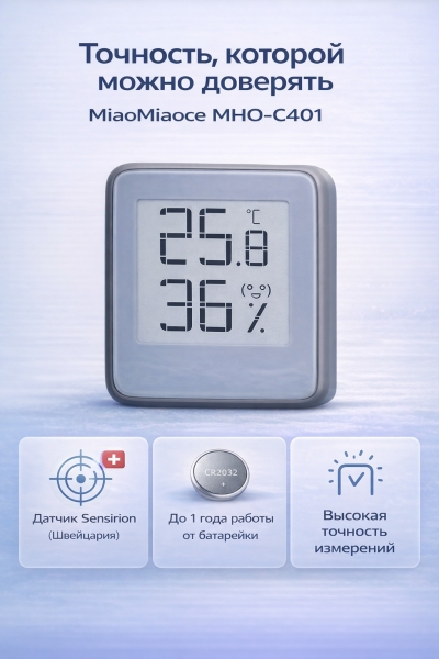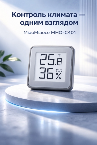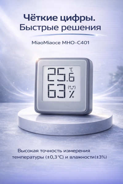 Контролируйте микроклимат без компромиссов. MiaoMiaoce MHO-C401 — компактная и стильная метеостанция с высокой точностью измерения температуры (±0,3 °C) и влажности (±3%). Быстро показывает, комфортно ли в помещении, и помогает вовремя принять решение — включить кондиционер или проветрить комнату.