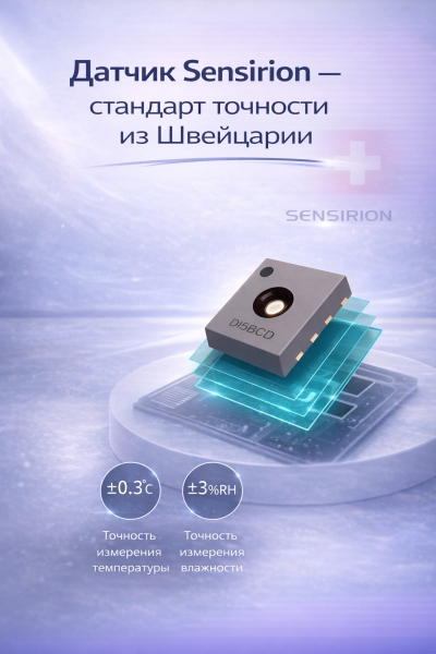 Большой E-Ink дисплей обеспечивает идеальную читаемость при любом освещении. Крупные цифры и понятные смайлики позволяют мгновенно оценить уровень комфорта.