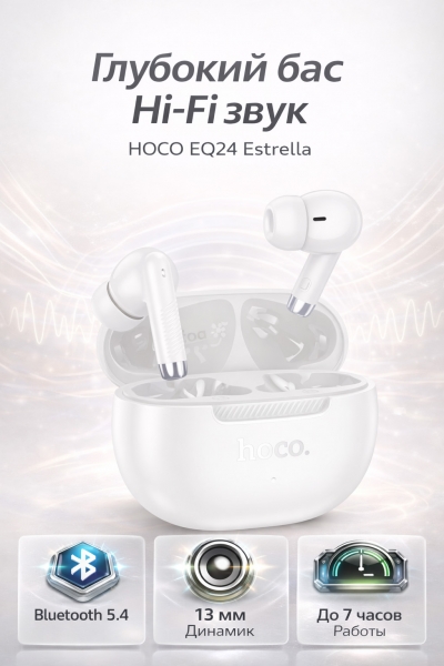 HOCO EQ24 Estrella — мощный звук, стабильное соединение и максимум автономности. Современный Bluetooth 5.4 обеспечивает быстрое подключение и стабильную работу без задержек. Динамики 13 мм создают насыщенный звук с глубокими басами и чистыми высокими частотами — музыка звучит громко, объемно и детально.