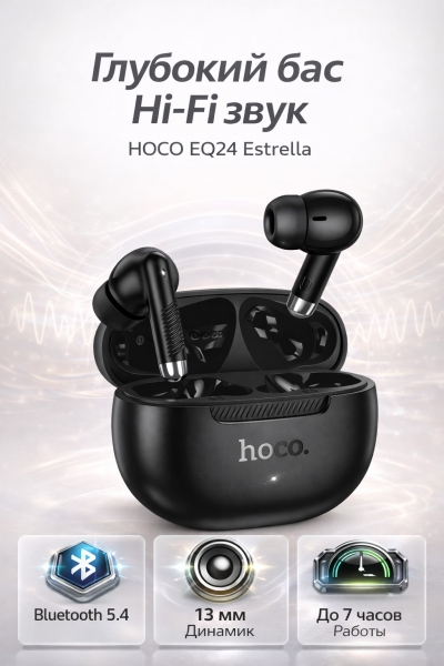 HOCO EQ24 Estrella — мощный звук, стабильное соединение и максимум автономности. Современный Bluetooth 5.4 обеспечивает быстрое подключение и стабильную работу без задержек. Динамики 13 мм создают насыщенный звук с глубокими басами и чистыми высокими частотами — музыка звучит громко, объемно и детально.