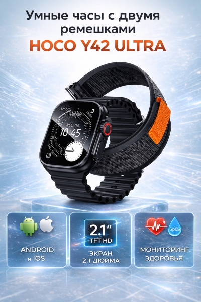 Смарт часы HOCO Y42 Ultra — это универсальные умные часы с функцией звонков, фитнес-трекером и большим HD экраном. Подойдут как мужские смарт часы и женские смарт часы для спорта, работы и активного образа жизни.