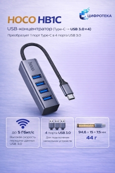 USB-концентратор HOCO HB1C — практичное решение для увеличения количества USB-портов на устройствах с разъемом Type-C.