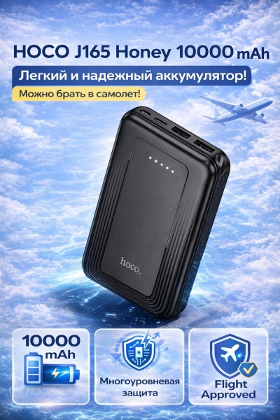 Внешний аккумулятор HOCO J165 Honey 10000 mAh - тонкий и надежный внешний аккумулятор, который легко помещается в сумку или рюкзак и всегда готов поддержать ваш смартфон, планшет или другие устройства в течение дня. Модель соответствует стандартам безопасности и разрешена к перевозке в ручной клади (Flight Approved) — отличный выбор для путешествий и деловых поездок.