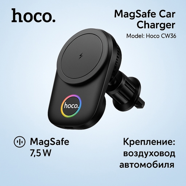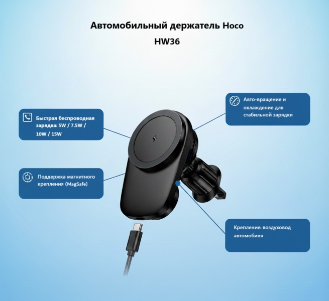 Автомобильный держатель Hoco HW36 — удобное и современное решение для вашего смартфона в дороге. Он оснащён беспроводной быстрой зарядкой и мощной магнитной фиксацией, благодаря чему телефон надёжно держится на месте даже на неровной дороге. Поддержка автоматического вращения позволяет легко повернуть экран для навигации в горизонтальное или вертикальное положение.