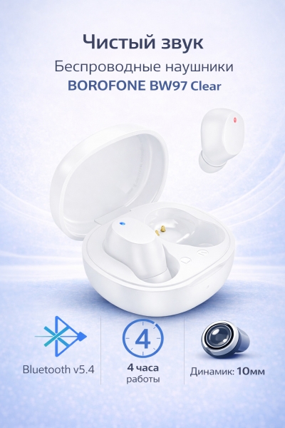 Беспроводные наушники BOROFONE BW97 Clear - современные TWS-наушники с чистым звуком и стабильным соединением для повседневного использования, работы и спорта. Компактный кейс легко помещается в карман, а лёгкие наушники комфортно сидят в ушах даже при длительном ношении.