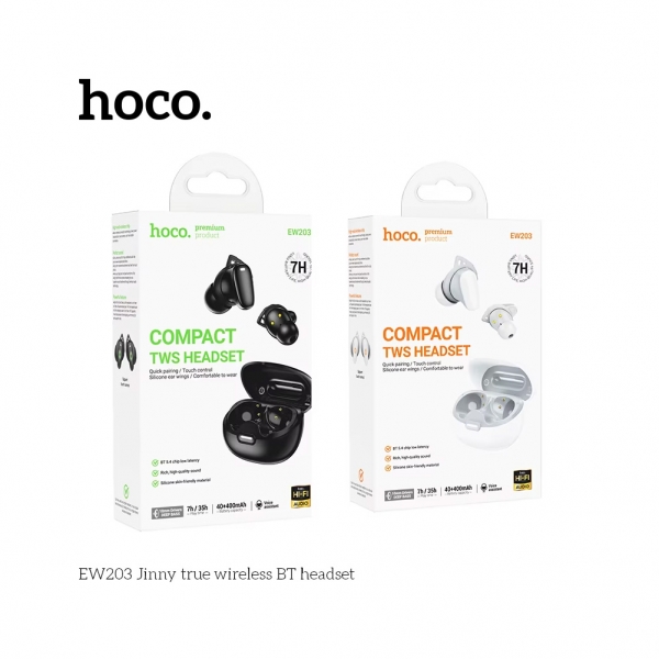 Hoco EW203 Jinny True Wireless — это универсальные наушники для музыки, звонков и фильмов, которые обеспечат свободу движения, стабильное соединение и качественный звук в любой ситуации.
