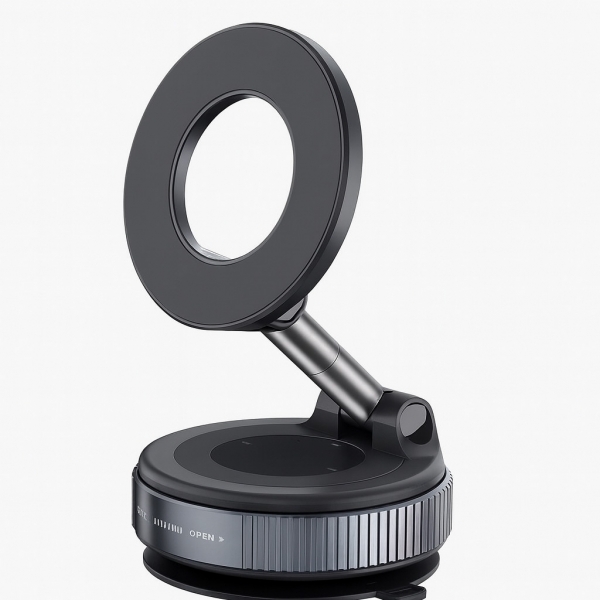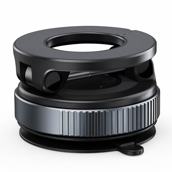 Усиленная присоска обеспечивает прочное сцепление с поверхностью, а механизм фиксации прижимает держатель максимально плотно. Это позволяет крепить устройство даже на слегка текстурированные поверхности.