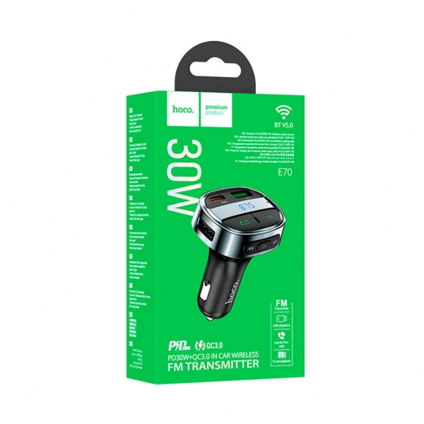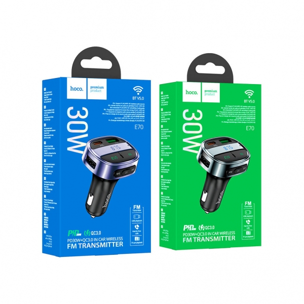 Hoco E70 — это универсальное автомобильное зарядное устройство с функцией FM-трансмиттера, которое поддерживает беспроводное воспроизведение музыки через Bluetooth 5.0 или с USB-накопителя (до 32 Гб).