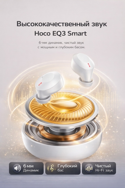 Hoco EQ3 Smart TWS — это компактные и удобные беспроводные наушники, созданные для тех, кто ценит качественный звук, стабильное подключение и комфорт в повседневном использовании. Модель оснащена современной технологией Bluetooth 5.3, обеспечивающей быстрое подключение и надежное соединение на расстоянии до 10 метров. Легкие и эргономичные наушники плотно сидят в ушах и подходят для прогулок, работы, учебы и тренировки.