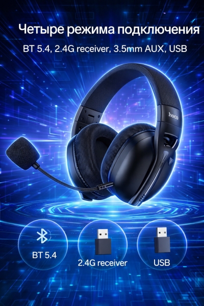 Игровые наушники Hoco W114 Magic four-mode gaming — универсальная модель с четырьмя режимами подключения для ПК, ноутбука, смартфона и игровых консолей. Подходят для динамичных игр, общения в голосовом чате и прослушивания музыки.