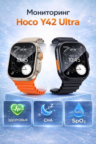 Умные часы HOCO Y42 ULTRA — современный смарт-гаджет с функцией звонков, большим HD экраном 2.1 дюйма и расширенными возможностями мониторинга здоровья. Смарт часы подходят для Android и iPhone, позволяют принимать и совершать звонки через Bluetooth, отслеживать физическую активность, контролировать сон, пульс и уровень кислорода в крови. Стильный дизайн вдохновлён Apple Watch Ultra, а в комплекте сразу два ремешка для смены стиля.