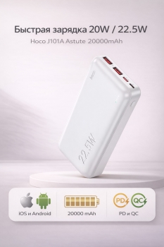 Внешний аккумулятор Hoco J101A Astute 20000mAh, power bank PD 20W QC 22.5W белый